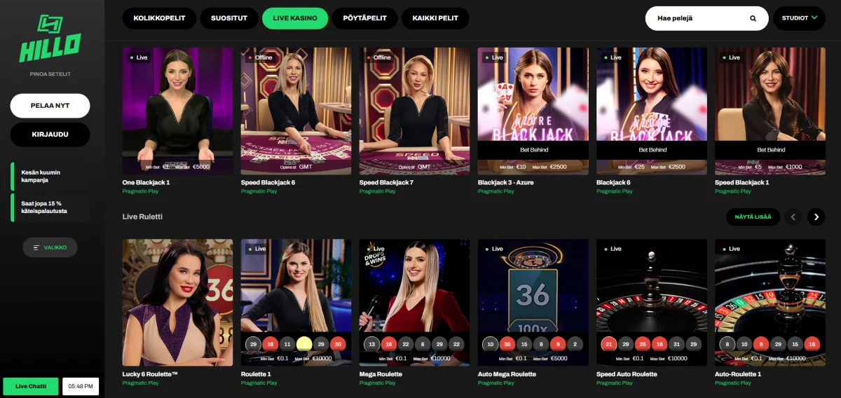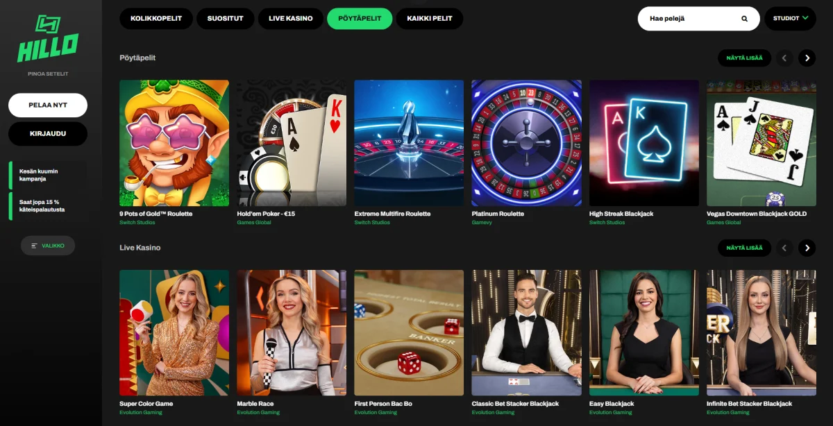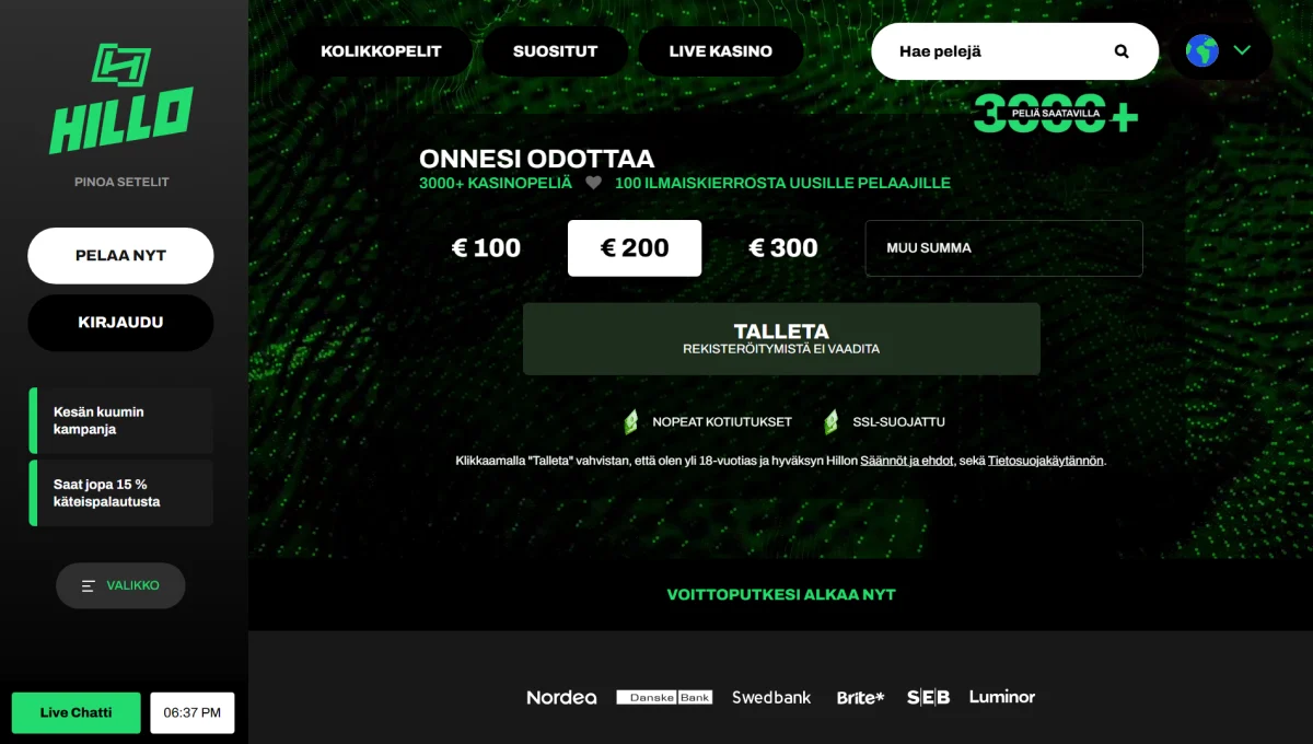 Hillo toimii puhtaasti euroissa ja nojaa pikakasinotyyliin Brite maksuihin: talletus aukeaa pankkitunnuksilla sekunneissa, summat 1-10 000 €.