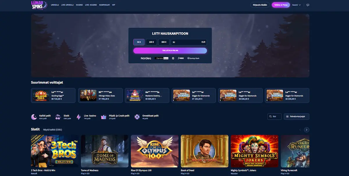 Lunar Spins Casino on hybridikasino, jossa voit aloittaa pelaamisen tekemällä pikatalletuksen tai voit rekisteröidä pelitilin itse, jolloin saat käyttöön muitakin maksutapoja kuten Paysafecardin. Pelivalikoima ylittää 6 000 pelin rajan ja mukana on myös vedonlyönti, mikä tekee kasinosta monipuolisen vaihtoehdon. Kasinolla on Maltan pelilisenssi, joten voitot voi kotiuttaa täältä verovapaasti.