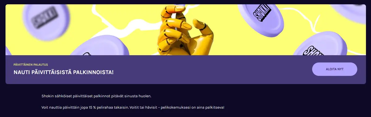 Shokki Casino on suomalainen pikakasino, joka tarjoaa laajan valikoiman kasinopelejä, kuten kolikkopelejä, pöytäpelejä ja live-pelejä. Shokki Casino tunnetaan erityisesti nopeasta pääsystä pelien maailmaan, näppäristä kotiutuksistaan sekä hyvästä käteispalautuksestaan. Kasinon suomalainen asiakaspalvelu palvelee pelaajia nopeasti. Kasino toimii Curacaon lisenssin alaisuudessa ja noudattaa alan säädöksiä, varmistaen pelaajien turvallisuuden ja reilun pelaamisen. Kasinon toimintaa siis säädellään ja valvotaan viranomaisen toimesta.
